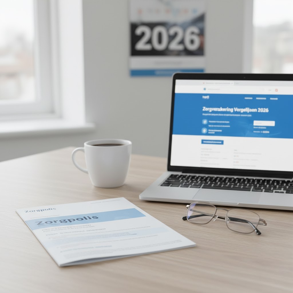 Een rustige werkplek met een laptop waarop een vergelijkingssite voor zorgverzekeringen in 2026 openstaat. Op tafel liggen een zorgpolis, een bril en een kop koffie. In de achtergrond hangt een kalender met het jaartal 2026. De afbeelding symboliseert het vergelijken van zorgpremies en het kiezen van de juiste zorgverzekering voor het nieuwe jaar.