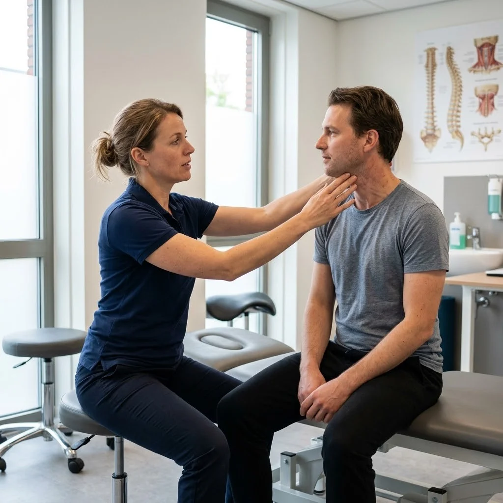 Een fysiotherapeut voert in een moderne behandelruimte een rustig gesprek met een patiënt over nekklachten. De afbeelding past bij een nieuwsartikel over patiëntveiligheid, nekbehandelingen en het belang van passende fysiotherapeutische zorg.